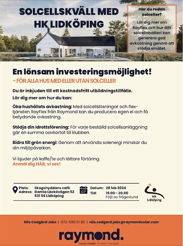 Onsdagen den 28/2 bjuder vår sponsor Raymondsolar in till kostnadsfri solcellsträff på Skogshyddans café.